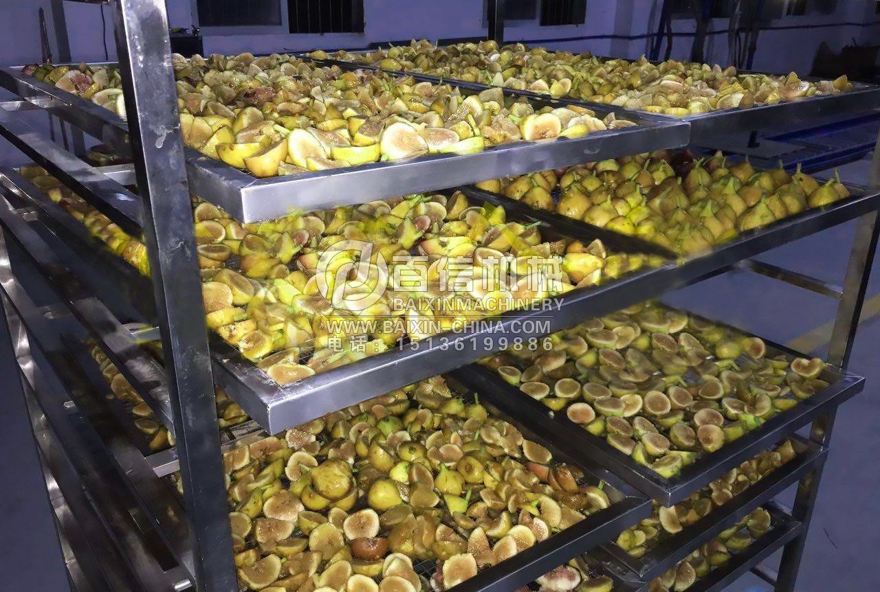 本工程位于四川綿陽市某果業開發有信息公司,為無花果果干烘干項目。客戶原為電烘房,日處理鮮果600Kg,能耗800度,烘干比例為8:1,烘干時間65-75℃,烘干過程由于均勻性差,需要人為2-4小時進行一次倒盤倒車且人工排濕。季節為7-10月,環境氣溫在25℃以上。2015年7月成功完成建設一套日處理鮮果2500斤的無花果專業熱泵烘干設備,將無花果烘干能耗降低到原來的30%以內,同時實現了烘干過程無人值守,節約了人工開支,整個烘干過程無任何污染和添加、使品質*了大幅提高,順利協助客戶將無花果果干打入了航空食品領域。