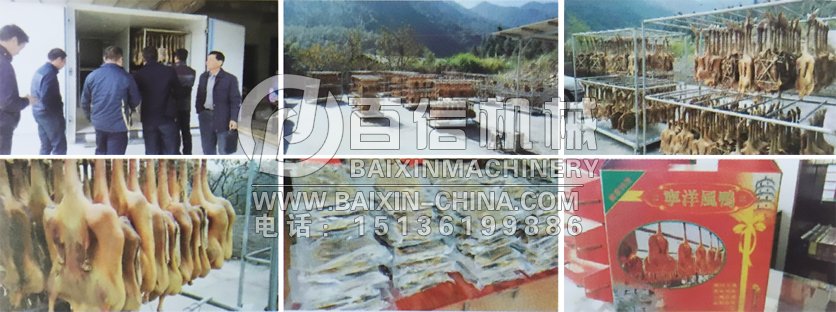 板鴨冷熱交替烘干效果和品質 佳,前期制冷在8℃左右進行冷干約12小時;中期白天在35-40℃(模式:烘干+排濕),夜間采用8℃冷干,使鴨體定型,否則一次烘干易變暗褐色,外觀不良,總耗時約100個工時;后期24小時,溫度約40℃,烘干濕度30%左右。