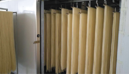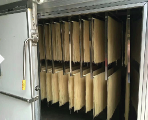 米粉如果放置形式為掛起來(lái)的,對(duì)風(fēng)路有影響,需要加裝軌道電機(jī)來(lái)使風(fēng)量和熱量更均均。否則,容易出現(xiàn)風(fēng)路前面的過(guò)干,而風(fēng)路尾端又還沒(méi)有干的情況。烘干過(guò)程中,宜以低溫大風(fēng)量為合適。過(guò)高的溫度,極容易出現(xiàn)斷粉。風(fēng)量不夠,傳熱不均,也是另外一個(gè)很重要的問(wèn)題。另外,烘干后不要馬上拉出來(lái),烘干房?jī)?nèi)外溫差過(guò)大,極容易造成米粉卷曲變形,造成外觀缺陷。