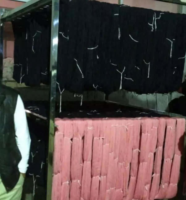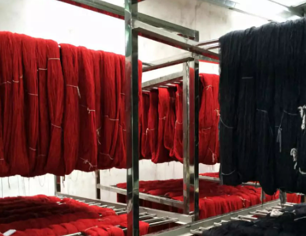 2:一車間的大姐非常認真把紗線均勻的掛在不銹鋼的物料架上,她說,今天還有很多批紗線將陸續染好顏色,等待烘干出貨。